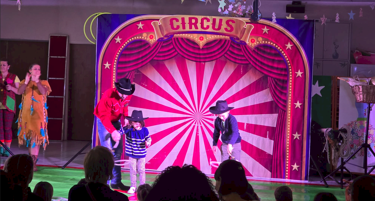 Les enfants ont assisté à un spectacle haut en couleurs intitulé « Cirque rodéo », mêlant clowns, musiciens, cow-boys et ambiance western. Animaux, jonglerie, jeux de lumière et univers festif ont plongé petits et grands dans la magie de Noël.